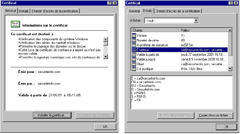 Certificat Auto signé : un certificat auto signé contient comme tout certificat une clé publique. Sa particularité réside dans le fait que ce certificat est signé avec la clé secrète associée. Dans ce cas précis, l'autorité de certification est donc le détenteur du certificat.