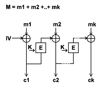 Le message initial M est divisé en n blocs mi conformément aux spécifications de l'algorithme (par exemple en blocs de 64 bits). Chaque bloc donne un chiffré correspondant (ci) après cryptage suivant le même algorithme E utilisant la même clé K. Comme expliqué ci-dessus, le mode CBC introduit une dépendance entre deux cycles de cryptage : le chiffré obtenu au rang i-1 est utilisé pour obtenir le chiffré du rang i. Concrètement, ce chiffré ci-1 subit un XOR avec le bloc mi.